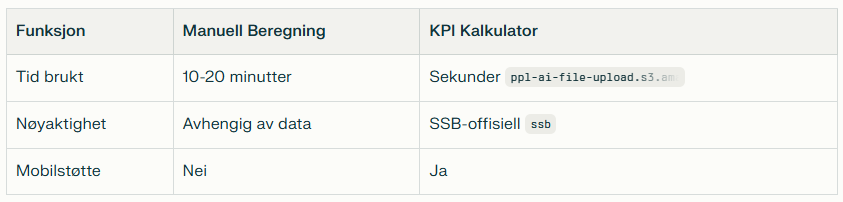 Tradisjonelle regneark er tidkrevende og feilutsatt. En online KPI kalkulator automatiserer prosessen med SSBs oppdaterte data.